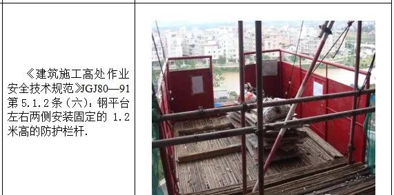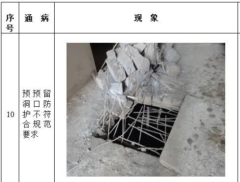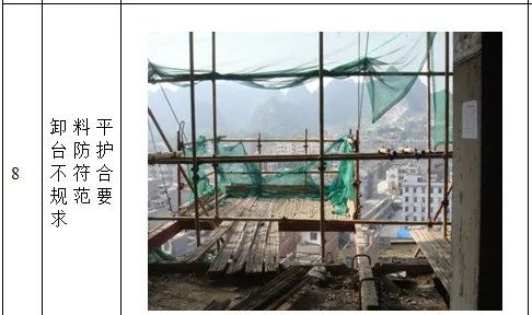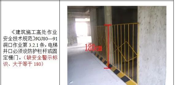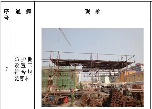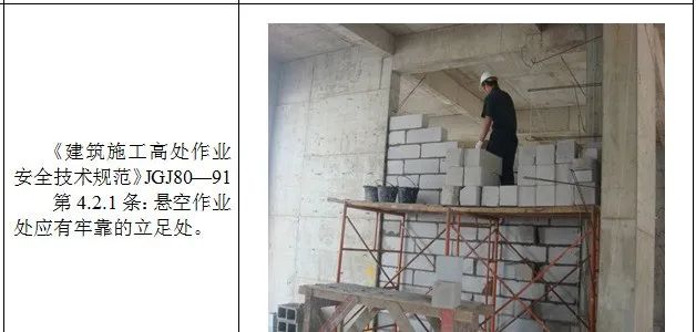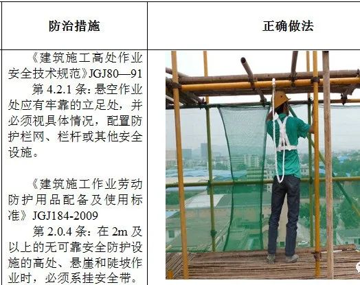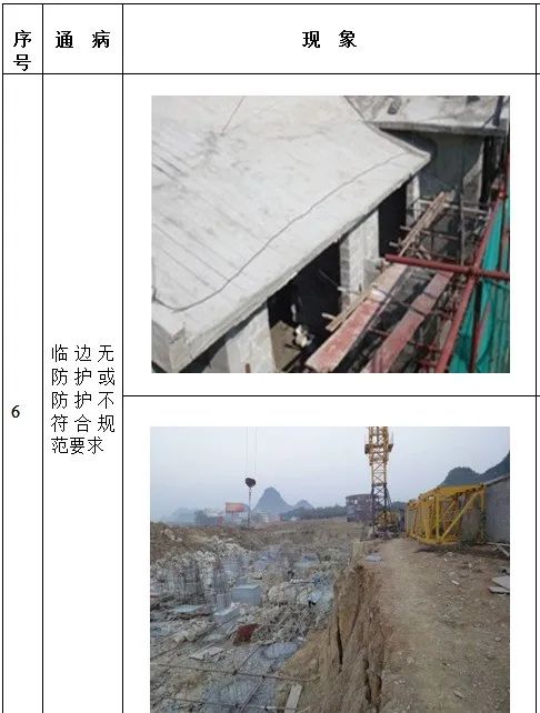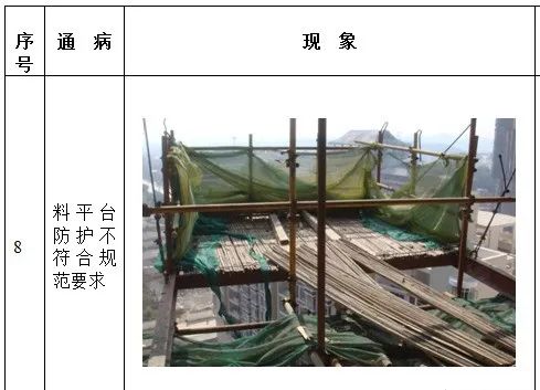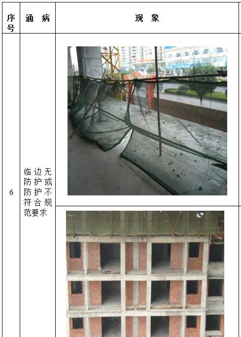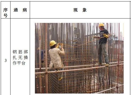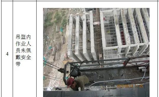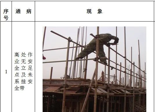 1、高处作业无安全立足点及未系挂安全带; 2、砌筑马櫈搭设不符合要求; 3、高处钢筋绑扎无操作平台; 4、吊篮内作业人员未佩戴安全带; 5、安全帽佩戴不规范; 6、临边无防护或防护不符合规范要求 7、防护棚搭设不符合规范要求; 8、卸料平台防护不符合规范要求; 9、电梯井防护不符合规范要求; 10、预留洞口防护不符合规范要求; 11、后浇带防护不符合规范要求; 12、伸缩缝防护不符合规范要求。