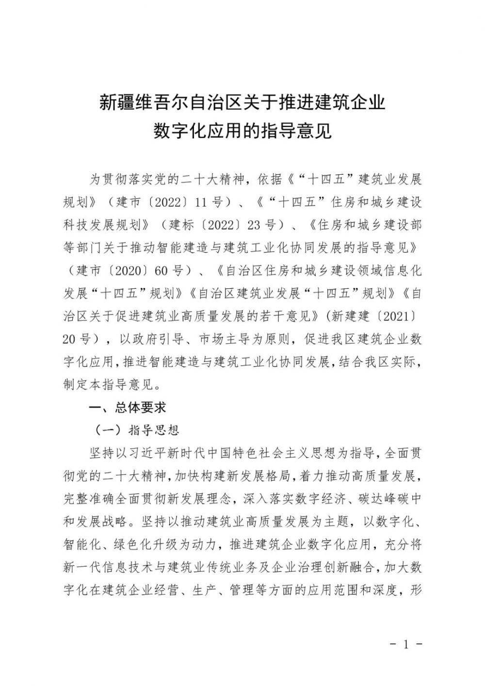 为加快数字经济在建筑企业的推广应用,实现业务模式的优化与创新,助力保障智能建造与建筑工业化协同发展,推进建筑业高质量发展,我厅研究制定了《新疆维吾尔自治区关于推进建筑企业数字化应用的指导意见》,现印发你们,请遵照执行。